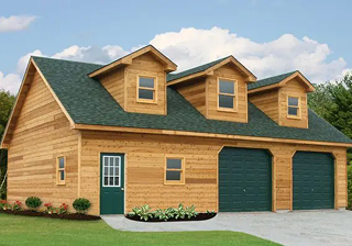 The Shenandoah series offers customizable, rustic-style garages, workshops, and storage structures, including 2-story options, 3-car configurations, and units featuring attached pavilions, dormers, and varied siding options.